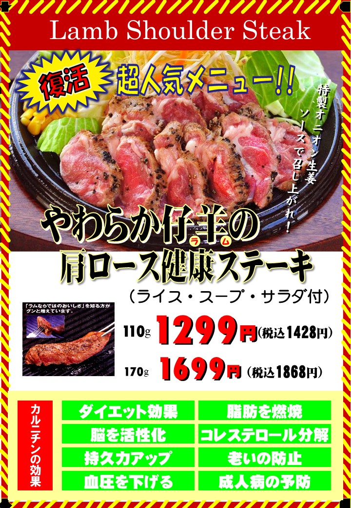 【一部店舗限定】復活!超人気ニュー「やわらかラムの肩ロース健康ステーキ」始まりました!